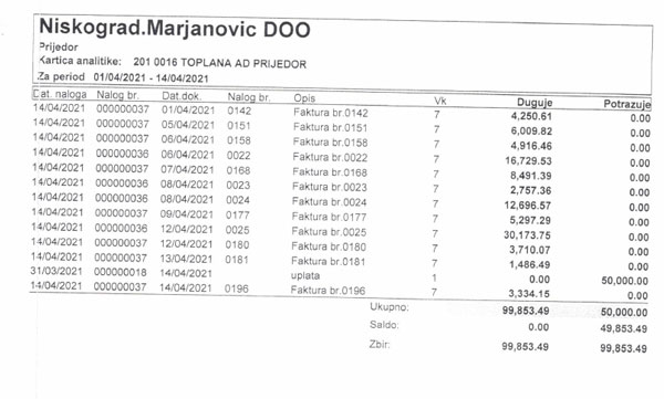 Mi kao dobavljač smo u navedenom periodu izvršili isporuku energenata u iznosu od 189.471,29 KM. Gore navedeno preduzeće je za pomenuti period uplatilo iznos od 180.000,00 KM, od kada je za vršioca dužnosti direktora imenovan Duško Miletić (period od 12.03.2021. do 14.04.2021.godme). Navedeno se jasno može vidjeti iz analitičke kartice koju ćemo dostaviti na uvid.
