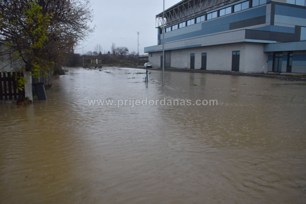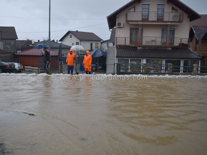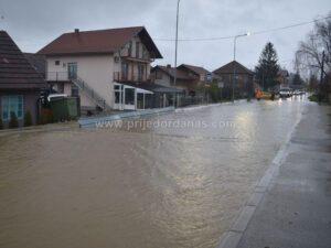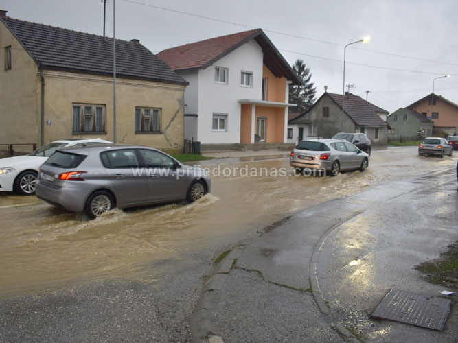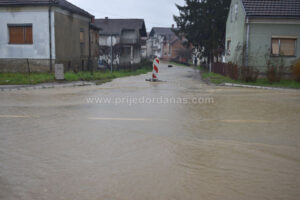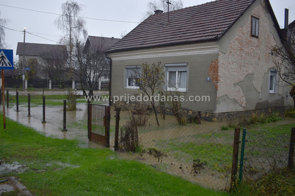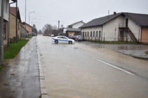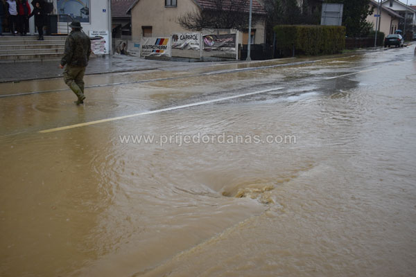 Voda je na kolovozu, prelijeva se preko trotoara u dvorišta koja su poplavljena sa obje strane ceste.