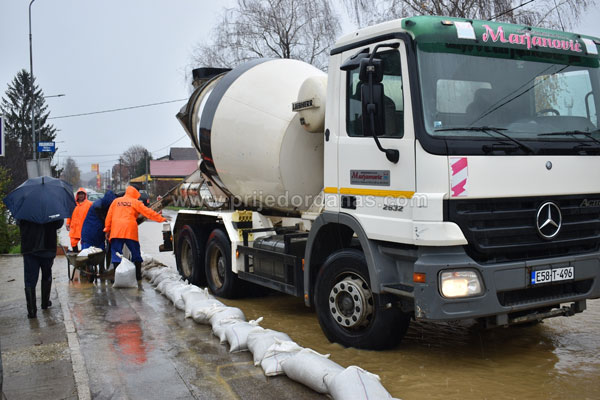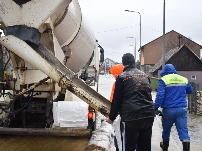 Stigao je mikser-kamion preduzeća “Niskogradnja Marjanović” koji zajedno sa mještanima pijeskom puni vreće koje postavljaju na trotoar.