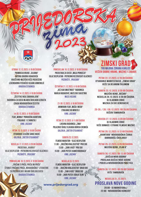 Načelnik Odjeljenja za privredu i preduzetništvo Rade Rosić rekao je da će u okviru Prijedorske zime 2023 od 22. decembra biti i Zimski grad na Trgu majora Zorana Karlice gdje će se sa ugostiteljima i izlagačima organizovati večeri dobre hrane, muzike i zabave.