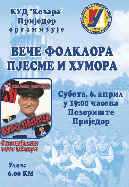 Osim članova KUD “Kozara” kao specijalni gost večeri nastupiće poznati humorista Đuro palica.