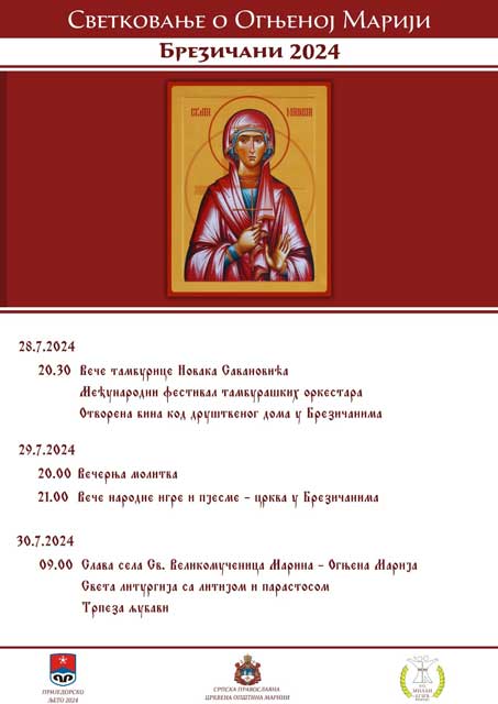 Slava sela, Sveta Velikomučenica Marina, u narodu poznatija kao Ognjena Marija, biće obilježena u utorak, 30.jula, u 9.00 časova svetom liturgijom, potom parastosom i trpezom ljubavi.