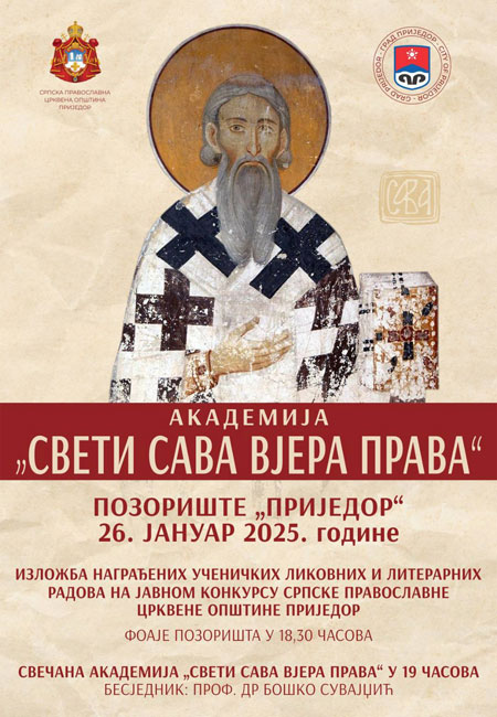 Akademija “Sveti Sava vjera prava” biće održana u Pozorištu Prijedor u 19.00 časova, besjednik je profesor Boško Suvajdžić, a organizatori Gradska uprava i Srpska pravoslavna crkvena opština Prijedor.
