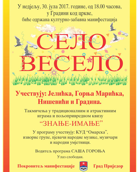 “Selo veselo“ je tradicionalna i jedna od najposjećenijih manifestacija „Kulturnog ljeta“, a njen cilj je oživljavanje i unaprijeđenje društvenog života u prijedorskim selima.
