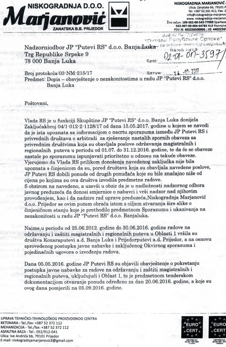 „Jedini razlog zbog kojeg postupak javne nabavke za Oblast 1. još nije završen jesu uporni i nezakoniti pokušaji odgovornih lica u „Putevima RS“ da se ugovor dodijeli „Kozaraputevima“ i „Prijedorputevima“, navodi se dopisu „Niskogradnje Marjanović“.
