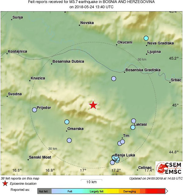 Kako javlja Evropsko-mediteranski seizmološki centar (EMSC) zemljotres je registrovan 27 kilometara sjeverozapadno od Banjaluke.