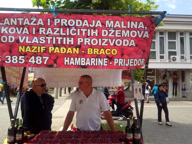 Na nekoliko štandova ovogodišnji rod maline iz svojih malinjaka prodaje desetak malinara, po cijeni od jedne do četiri KM, zavisno od pakovanja.