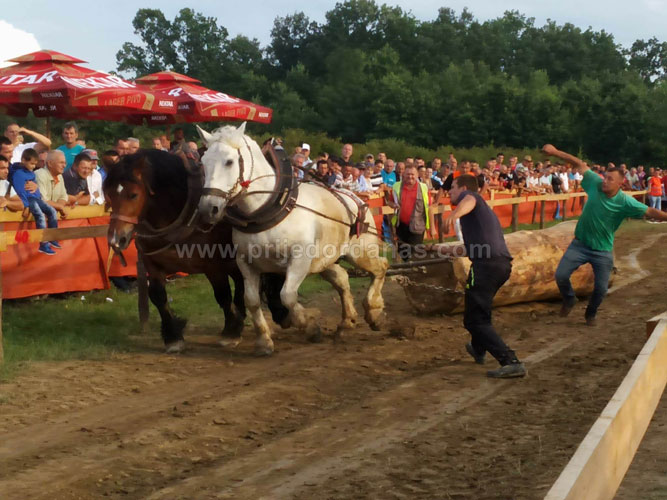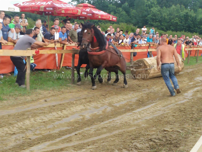 Parovi konja kao i samci takmiče se ko će biti najbrži u vuči balvana.