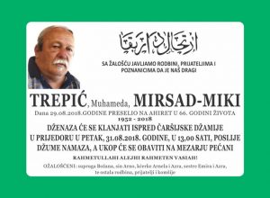 Posljednji ispraćaj Mirsada-Mikija Trepića biće ispred Čaršijske džamije u Prijedoru u petak, 31. avgusta, gdje će se klanjati dženaza u 13:00 časova poslije džume namaza, dok će se ukop obaviti nakon toga na mezarju Pećani.