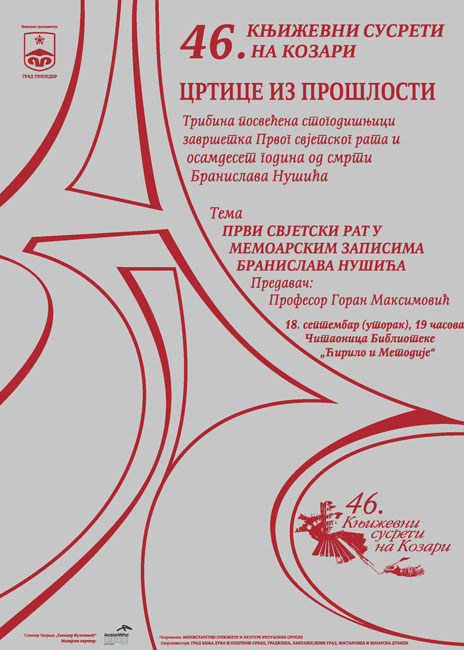 Povodom obilježavanja stogodišnjice završetka Prvog svjetskog rata i 150 godišnjice rođenja Branislava Nušića, u okviru tribine „Crtice iz prošlosti“ Goran Maksimović, profesor Filozofskog fakulteta u Nišu, održaće tribinu na temu „Prvi svjetski rat u memoarskim zapisima Branislava Nušića“ .