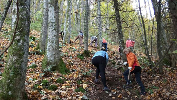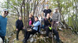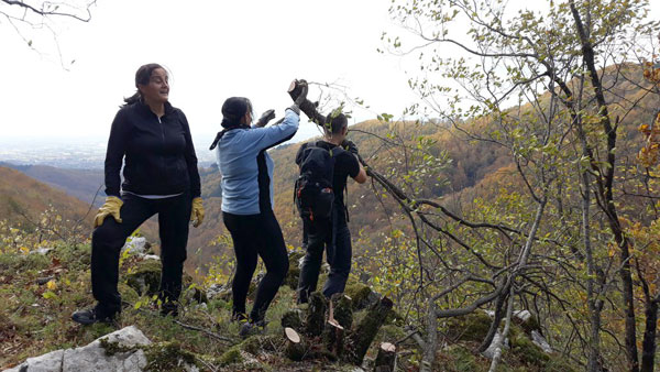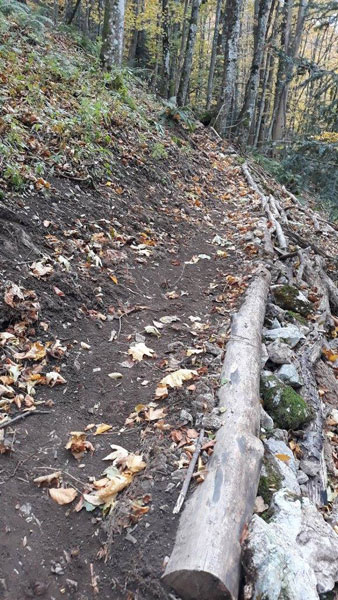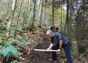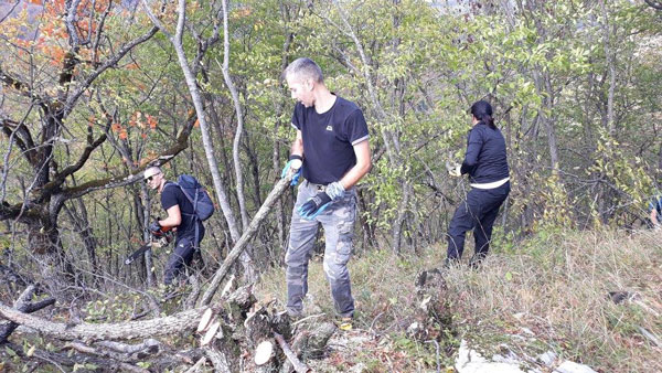 U subotu smo čistili i prosijecali zapadni dio staze, od Planinarskog doma „Kotlovača“ do vrha „Bijele Stijene“. Već u ranim jutarnjim satima, mala ali vrijedna grupa planinara je krenula uz brdo, noseći grablje, krampove, lopate, sjekire i motornu pilu.