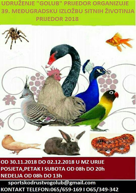 Društvo za uzgoj i zaštitu sitnih životinja „Golub“ iz Prijedora u periodu od 30.novembra do 2.decembra 2018. godine organizuje 39. Međugradsku izložbu sitnih životinja “Prijedor 2018” koja će biti održana u prostorijama Mjesne zajednice Prijedor 2 u naselju Urije(preko puta crkve) u našem gradu.