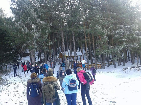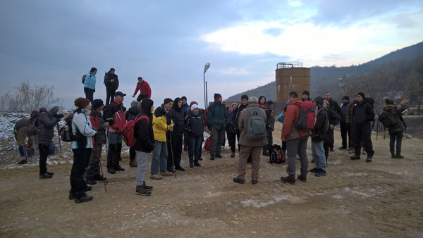 Uz pratnju vodiča Marka Sarića i Dragana Berića grupa planinara kojima nije bilo lijeno ustati tog jutra krenula je uz etaže kamenoloma. Vijugavim putevima se lagano penjalo uz stalno lijep pogled iznad oblaka na cijelu okolinu. Na najvišoj tački kamenoloma od 690m zašli smo u šumu i oprostili se od Drenovače. Tu je već bio pojas pod snijegom koji cijeloj priči daje vrlo ozbiljan ton jer planina je to.