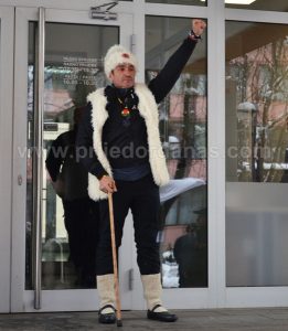 Davor Dragičević se jutros u Okružnom javnom tužilaštvu u Prijedoru pojavio obučen kao David Štrbac, lik iz poznatog djela Petra Kočića „Jazavac pred sudom“.