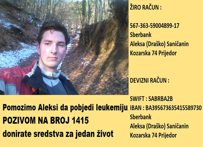 Dvadesetjednogodišnji Aleksa Saničanin iz Prijedora boluje od akutne limfoblastne leukemije od oktobra 2017.godine.