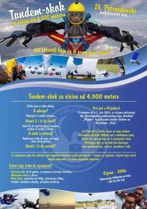 Leti kao ptica, čvrsto vezan za svog tandem-instruktora dostigni 200 km/sat u slobodnom padu, doživi 60 sekundi koje će ti promijeniti život. Privilegija koja je do sada bila dostupna samo padobrancima, sada je ponuđena i tebi. U slobodnom padu 60 sekundi, pod kupolom padobrana nekih pet minuta – trenuci za vječnost, vrijeme koje nećeš nikada zaboraviti, sa ničim uporedivo iskustvo!