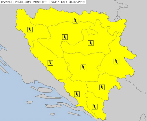 Nedjelja – 28. juli: Ponovo žuti meteoalarm za područje Prijedora admin July 28, 2019 Nedjelja – 28. juli: Ponovo žuti meteoalarm za područje Prijedora2019-07-28T11:41:07+02:00 Društvo Likes Rating 12345Hidrometeorološki zavodi izdali su žuti meteoalarm za područje Prijedora za ovu nedjelju, 28. juli 2019. godine. Očekuje se grmljavina. Budite spremni za ove vremenske uslove. Priredio – Aleksandar Drakulić – www.prijedordanas.com