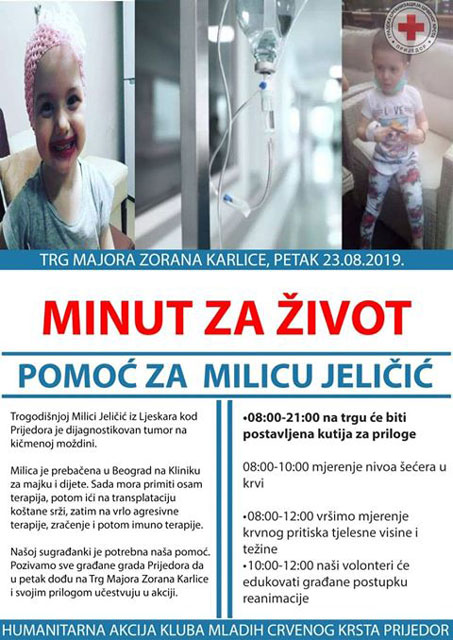 “Apelujemo na sve sugrađane koji nisu u prilici da uplate veći iznos da izađu na Trg, gdje prikupljamo doborovoljne priloge kako bismo našoj malenoj sugrađanki dali priliku da pobijedi bolest i nastavi život”, rekao je predsjednik Kluba mladih Crvenog krsta Srđan Kunić.
