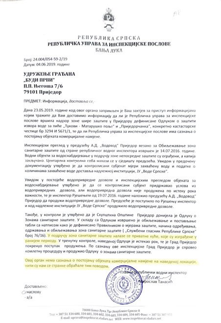 Pitali smo Republičku uprave za inspekcijske poslove jesu li vršili nadzor zone šire zaštite u Prijedoru konkretno na ovoj katastarskoj čestici. Odgovorili su nam da jesu, ali iz odgovora je jasno da ni oni nisu primijetili objekat. Republički vodni inspektor, kako je navedeno u odgovoru, zapazio je u toj zoni samo privatne kuće, izgrađene ranije, kao i da je vodoprivredna dozovla produžena po nalogu inspektora.