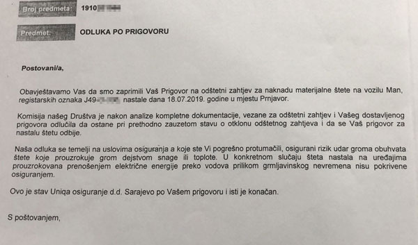 Međutim, u odgovoru “Unika osiguranja” oštećenom vlasniku kamiona u kojem se navodi da je konačan, piše: „Naša odluka se temelji na uslovima osiguranja a koje ste vi pogrešno tumačili, osigurani rizik udar groma obuhvata štete koje prouzrokuje grom dejstvom snage ili toplote. U konkretnom slučaju šteta nastala na uređajima prouzrokovana prenošenjem električne energije preko vodova prilikom grmljavinskog nevremena nisu pokrivene osiguranjem.”