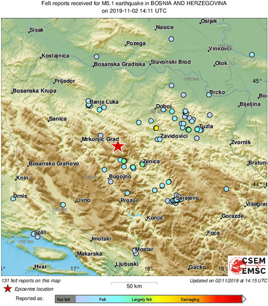 Zemljotres je zabilježen na dubini od 10 kilometara na oko 80 kilometara sjeveroistočno od Sarajeva, te 60 kilometara jugoistočno od Banjaluke.