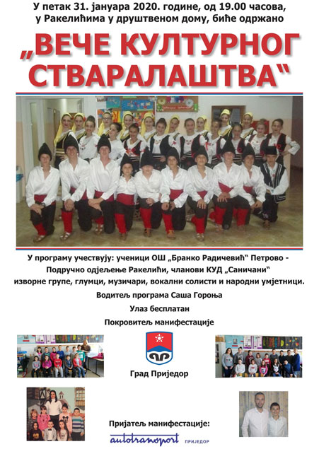 Nakon Donjeg Petrovog Gaja, Ljeskara i Gornjih Orlovaca, „Veče kulturnog stvaralaštva“ biće održano u Rakelićima u društvenom domu u petak, 31.januara, s početkom u 19 časova.