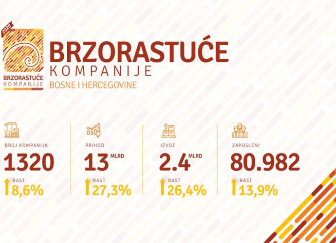 Ukupni prihod koji su ostvarile sve rangirane brzorastuće kompanije u BiH, prema posljednjim finansijskim izvještajima, u 2018. iznosio je 13 milijardi KM ili 27,2 posto više nego prethodne godine. Ove kompanije realizirale su 2,4 milijarde KM izvoza, što je povećanje od 26,4 posto u odnosu na 2017., a one učestvuju u, više nego značajnom procentu, u ukupno angažiranoj radnoj snazi bh. ekonomije. U 2018. godini kompanije koje su identificirane kao brzorastuće zapošljavale su 80.982 osobe, te su u odnosu na godinu ranije povećale broj zaposlenika za 13,9 posto.