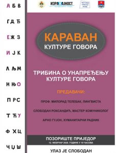 Javna edukativna tribina “Karavan kulture govora” biće održana i u Prijedoru u srijedu 12. februara 2020. godine sa početkom u 19 časova u Pozorištu Prijedor, kao dio akcije Ministarstva informisanja i kulture Republike Srbije, koju je podržalo Ministarstvo prosvjete i kulture Republike Srpske i Udruženje za unapređenje i razvoj kulture javnog govora “Izražajnost” iz Srbije