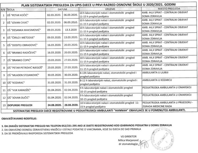 Roditelji treba da zakažu sistematski pregled djeteta pozivom na telefonski broj 052/231-295, ako je dijete registrovano kod izabranog pedijatra u Domu zdravlja Prijedor, da donesu zdravstvenu knjižicu sa podacima o vakcinama koje su djeca do sada primila i da se pridržavaju rasporeda sistematskih pregleda.