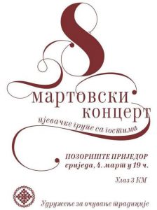 Ulaznice za osmomartovski koncert pjevačke grupe Udruženja za očuvanje tradicije i prijatelja po cijeni od 3 KM možete kupiti na blagajni Pozorišta prije početka koncerta.
