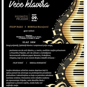 Koncert pod nazivom “Veče klavira” zakazan je za 19.30 časova, a cijena ulaznice je pet KM. Veče će upotpuniti nastup profesorice solo pjevanja Anete Šurlan.