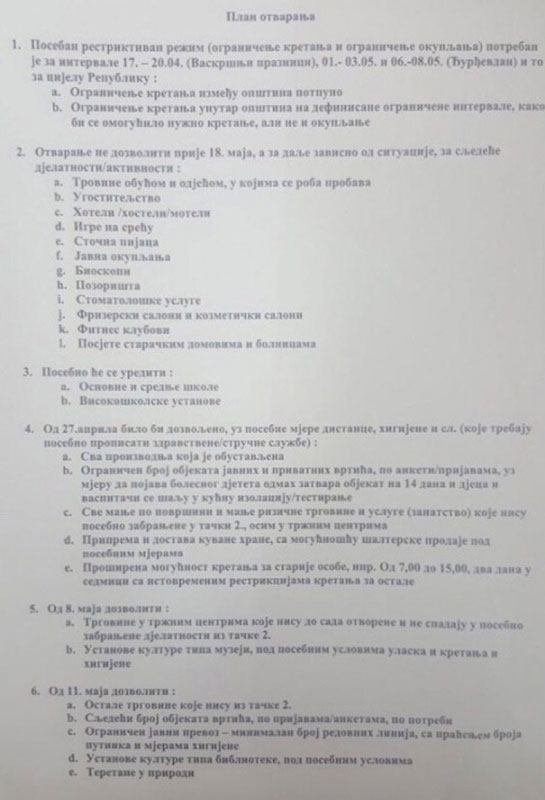 Pored toga, planirano je postepeno popuštanje restriktivnih mjera uz posebne mjere distance, higijene te upotrebu propisane opreme (maska, rukavice).
