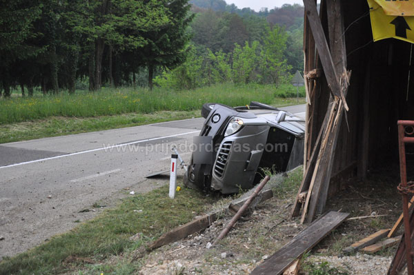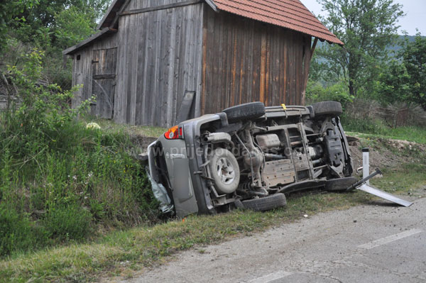 Iz za sada nepoznatih razloga, putnički automobil “Hjundai” sletio je sa kolovoza, udario u drvenu garažu pored puta, i potom se prevrnuo na bok u kanal pored ceste.
