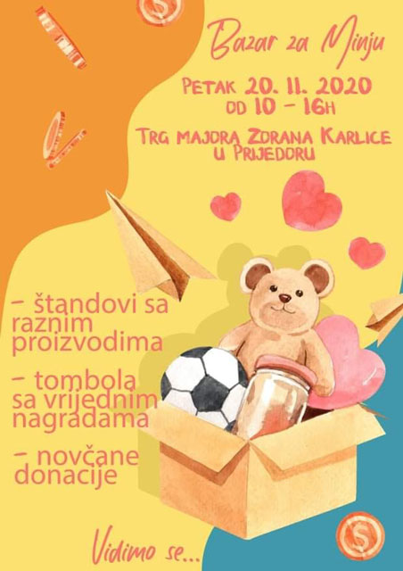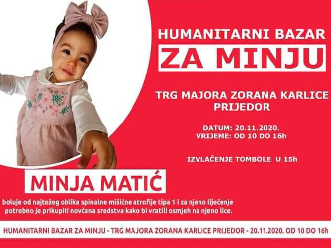 Na Trgu majora Zorana Karlice u Prijedoru u petak, 20. novembra, biće organizovan “Humanitarni bazar za Minju”, a sav prihod biće uplaćen na račun za liječenje djevojčice Minje Matić iz Kragujevca koja boluje od najtežeg oblika spinalne atrofije mišića.