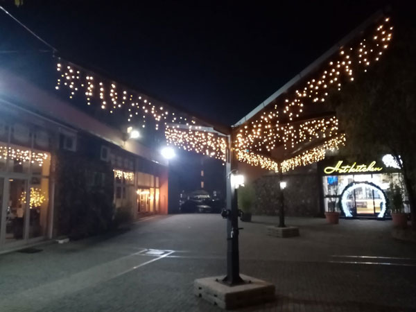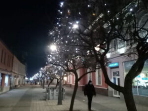 U glavnoj gradskoj ulici na stubovima svijetle i novogodišnji cvijetovi, dok su drveća ukrašena prazničnim svjećicama.
