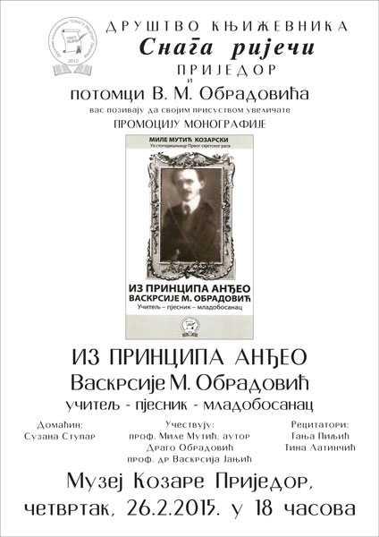 U organizaciji Društva književnika „Snaga riječi“ Prijedor danas će se u našem gradu održati promocija knjige Mile Mutića „Iz principa anđeo“ o životu i djelu Vaskrsije M. Obradovića, učitelja iz Omarske, pjesnika i mladobosanca.