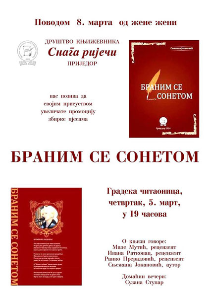 Povodom 8. marta, Dana žena, večeras (05.03.2015. godine) od 19.00 časova u Gradskoj čitaonici biće održana promocija knjige poezije Snježane Jokanović „Branim se sonetom“.