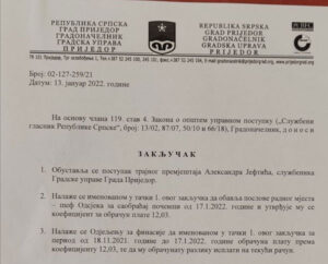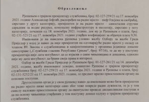 – Imenovani je na navedena rješenja uložio žalbu Odboru za žalbe grada Prijedora u kojoj je naveo da nije premješten na odgovarajuće radno mjesto u skladu sa Zakonom o službenicima i namještenicima, te da mu u postupku premještanja nije data mogućnost da se izjasni o svim činjenicama i dokazima, odnosno nije mu data mogućnost da brani svoja prava i interese – navedeno je između ostalog u zaključku gradonačelnika Javora.