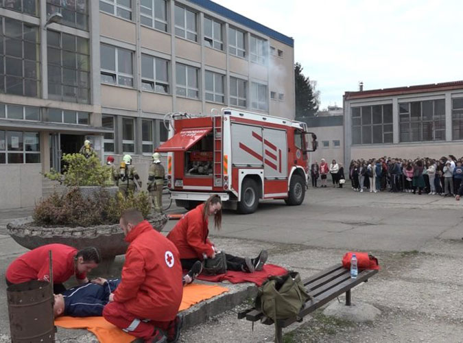 Učenici Osnovne škole ”Desanka Maksimović” danas su imali priliku da vide na licu mjesta kako se postupa u slučaju školskog požara. To su im prikazali prijedorski vatrogasci u pokaznoj vježbi u kojoj su učestvovali i đaci ove škole te članovi Crvenog krsta.