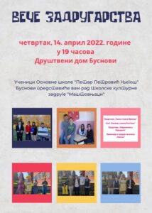 OŠ “Petar Petrović Njegoš” Busnovi: Veče zadrugarstva admin April 14, 2022 OŠ “Petar Petrović Njegoš” Busnovi: Veče zadrugarstva2022-04-14T15:10:54+02:00 Mladi Likes 0Rating 12345Ovoga četvrtka, 14. aprila 2022. godine u 19:00 časova u Društvenom domu u Busnovima biće održano Veče zadrugarstva. Učenici Osnovne škole “Petar Petrović Njegoš” Busnovi predstaviće lokalnoj zajednici rad Školske kulturne zadruge “Maštovnjaci”.