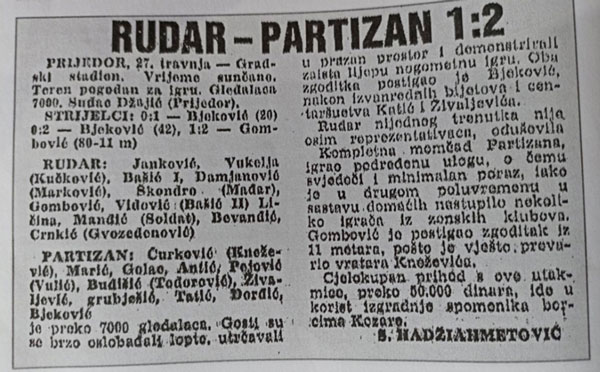 Na današnji dan prije 50 godina, na Gradskom stadionu u Prijedoru, prijateljsku utakmicu su odigrali Rudar i beogradski Partizan.