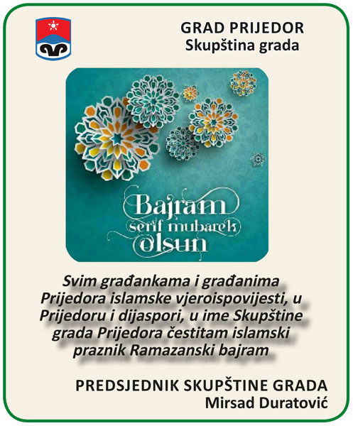 Povodom Ramazanskog Bajrama, u ime Skupštine Grada Prijedor i svoje lično ime, svim sugrađankama i sugrađanima islamske vjeroispovijesti, u Prijedoru i dijaspori, upućujem iskrene čestitke.