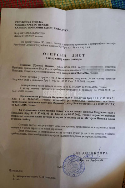 Matijaš je pušten nakon rješenja Okružnog suda Banjaluka, koji je prethodno uvažio zahtjev Matijaša za ponavljanje pravosnažno okončanog krivičnog postupka.