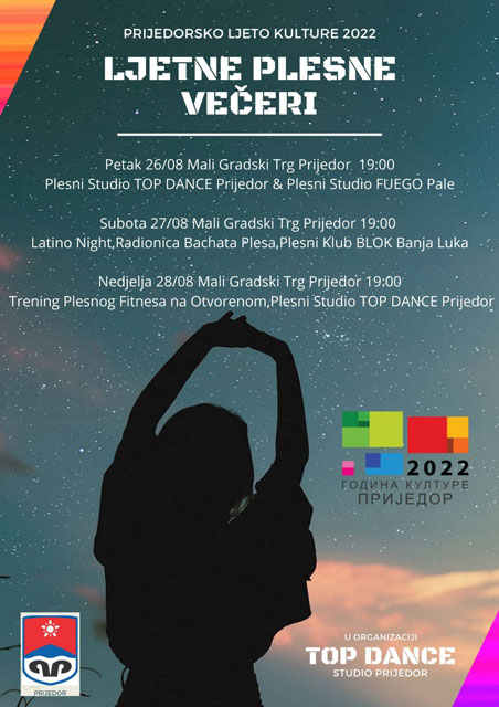 Od petka do nedjelje, svako veče u 19:00 časova, na Malom gradskom trgu, Prijedorčane očekuje zanimljivim program u kojem učestvuju članice PS “TOP DAnce” te njihovi gosti, Plesni studio “Fuego” Pale i Plesni studio “Blok” Banjaluka.
