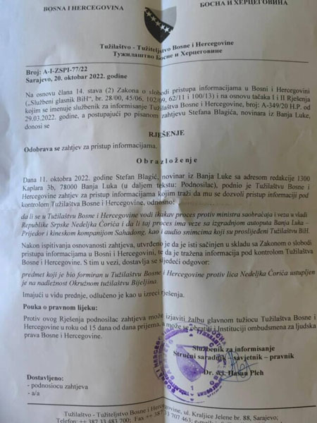 „Nakon ispitivanja osnovanosti zahtjeva, utvrđeno je da je isti sačinjen u skladu sa Zakonom i da je tražena informacija pod kontrolom Tužilaštva Bosne i Hercegovine. Predmet koji je bio formiran u Tužilaštvu BiH protiv lica Nedeljka Ćorića ustupljen je na nadležnost Okružnom tužilaštvu Bijeljina“, navode iz Tužilaštva BiH.