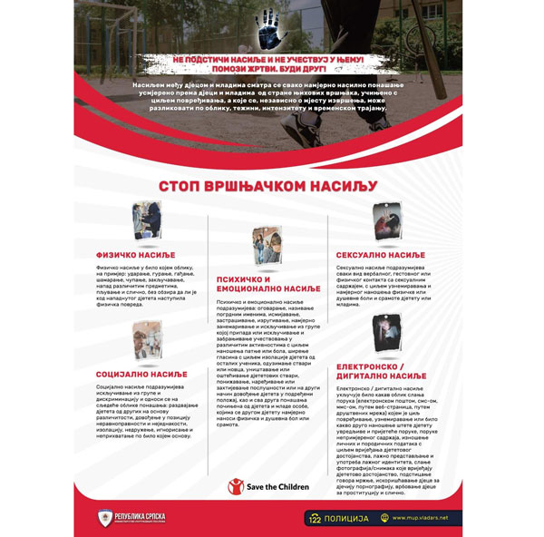 Realizujući kampanju Ministarstva unutrašnjih poslova Republike Srpske pod nazivom „Stop vršnjačkom nasilju“ policijski službenici Policijske uprave Prijedor dana 29.12.2022. godine sa početkom u 11,00 časova u „Srednjoškolskom centru“ u Prijedoru održaće predavanje za učenike srednjih škola na temu prevencije vršnjačkog nasilja.