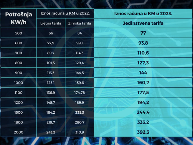 To znači da će građanima koji u januaru 2023. godine potroše 500 kilovata račun za struju iznositi 77 KM sa PDV-om, dok je u istom mjesecu ove godine iznosio 84 KM sa PDV-om.