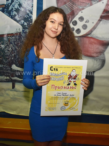 Prijedorčanka Elena Đurica pobjednica Novogodišnjih karaoka – FOTO/VIDEO admin December 17, 2022 Prijedorčanka Elena Đurica pobjednica Novogodišnjih karaoka – FOTO/VIDEO2022-12-17T00:18:54+01:00 Društvo, Foto dana, Mladi Likes 0Rating 12345Učenica Osnovne škole „Desanka Maksimović“ iz Prijedora Elena Đurica pobjednica je ovogodišnjeg izdanja Festivala “Djeca pjevaju hitove – Novogodišnje karaoke”, koji je održan u Sportskoj dvorani “Mladost” u Prijedoru. Ona je otpjevala pjesmu „Jedina“ Tošeta Proeskog, a o najboljima je odlučivao stručni žiri koji su činili Nebojša Aleksić, Senka Spasojević i Dejan Šarović. Drugo mjesto osvojio je Nikola Bojić iz OŠ “Branko Ćopić” Prijedor sa pjesmom “Dođi” grupe Parni valjak a treće Mia Milunović iz OŠ “Petar Kočić” Prijedor sa pjesmom “Ništa tvoje Ilme Karahmet. Najmlađa učesnica bila je Miljana Gašić dok je najbolji scenski nastup imala Marija Jovanović iz OŠ “Dositej Obradović” koja je izvela pjesmu “Rjabinuška” uz pomoć drugara iz škole. Četrnaestogodišnja pobjednica je učenica devetog razreda a za nastup se pripremala uz pomoć nastavnika Dragana Makimovića. -Uopšte nisam očekivala pobjedu. Utisci su odlični. Sprijateljila sam se sa dosta učesnika i svi su bili fenomenalni. Jako mi je drago što sam osvojila prvo mjesto – rekla je Đurica. U finalnoj večeri ovog tradicionalnog festivala bilo je 28 numera iz 10 prijedorskih i dvije osnovne škole sa područja opštine Novi Grad. Nastupilo je i sedam plesnih grupa iz Prijedora i Novog Grada. Za najbolju je proglašena plesna grupa OŠ “Branko Ćopić” Prijedor. U revijalnom dijelu nastupili su plesni studio “TOP DAnce” iz Prijedora i nekadašnje pobjednice Anđela Stanojević i Iva Dragojević. Organizator festivala bila je prijedorska podružnica Udruženja estradnih radnika i estradnih umjetnika Republike Srpske “Estrada Republike Srpske”, a podržali su ga brojni sponzori. Generalni pokrovitelji “Novogodišnjih karaoka” su Grad Prijedor i predsjednik Republike Srpske. Tekst i foto – www.prijedordanas.com