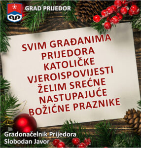 Svim građanima Prijedora katoličke vjeroispovijesti čestitam najradosniji hrišćanski praznik Božić sa željom da ga dočekate u miru i radosnom okruženju svojih najmilijih.