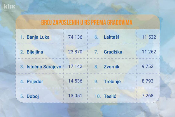 Prema informacijama koje smo dobili iz Porezne uprave RS, najuspješniji gradovi, po broju zaposlenih, su: